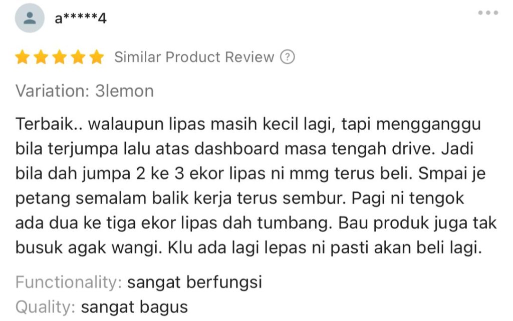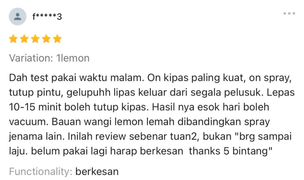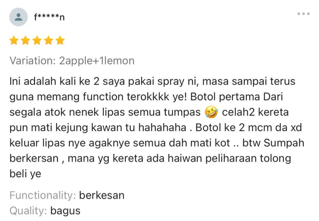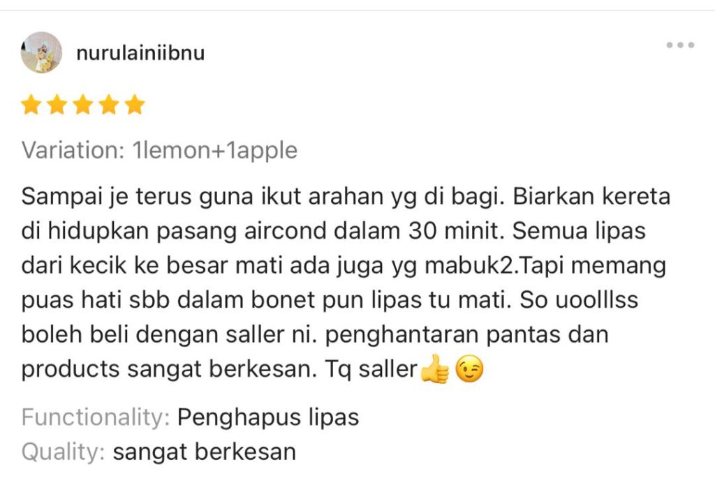 Hanya perlu spraykan dalam ruangan seperti kereta atau bilik, dan biarkan selama 45min